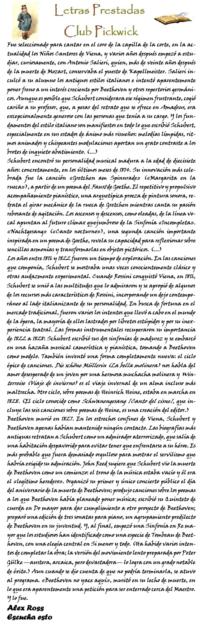 Nos acompaña en este Primer movimiento sobre Schubert con un texto extraído del capítulo dedicado al compositor en Listen to This (Escucha esto), donde, comenzando por sus inicios en el coro infantil y las enseñanzas de Salieri, el compositor alcanza una primera madurez a los diecisiete años. También se adentra Ross en las influencias y progresos que va alcanzando, citando uno de sus enormes valores, la creación de lieder, esas canciones que alcanzan con él su máximo esplendor, hasta reflejar los grandes ciclos de canciones, únicos hasta entonces, y que muestran lo más maravilloso del genio de Schubert. No deja Ross de manifestarnos una de las cualidades más particulares del compositor, su admiración incondicional mezclada con una timidez tremenda hacia la persona de Beethoven, a quien tanto admiró y a quien no fue capaz de acercarse en vida.