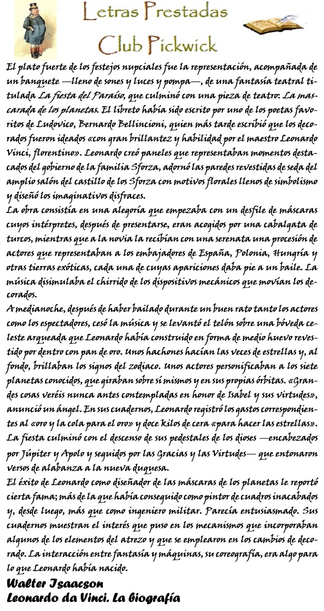 En el relato que nos acompaña, Isaacson nos acerca a la presencia de Leonardo en Milán a la que se hacía referencia anteriormente, centrándose en una de las facetas que más le hizo desarrollar en aquellos años y que concluyó con la celebración de La Festa dil Paradiso (La Fiesta del Paraíso), un espectáculo encargado por Ludovico, que fue ideado y organizado por Leonardo para celebrar en 1490 el matrimonio de su sobrino Gian Galeazzo con la Princesa de Nápoles, Isabel de Aragón.